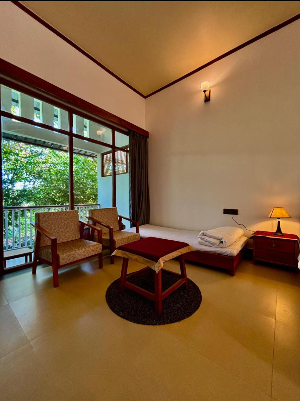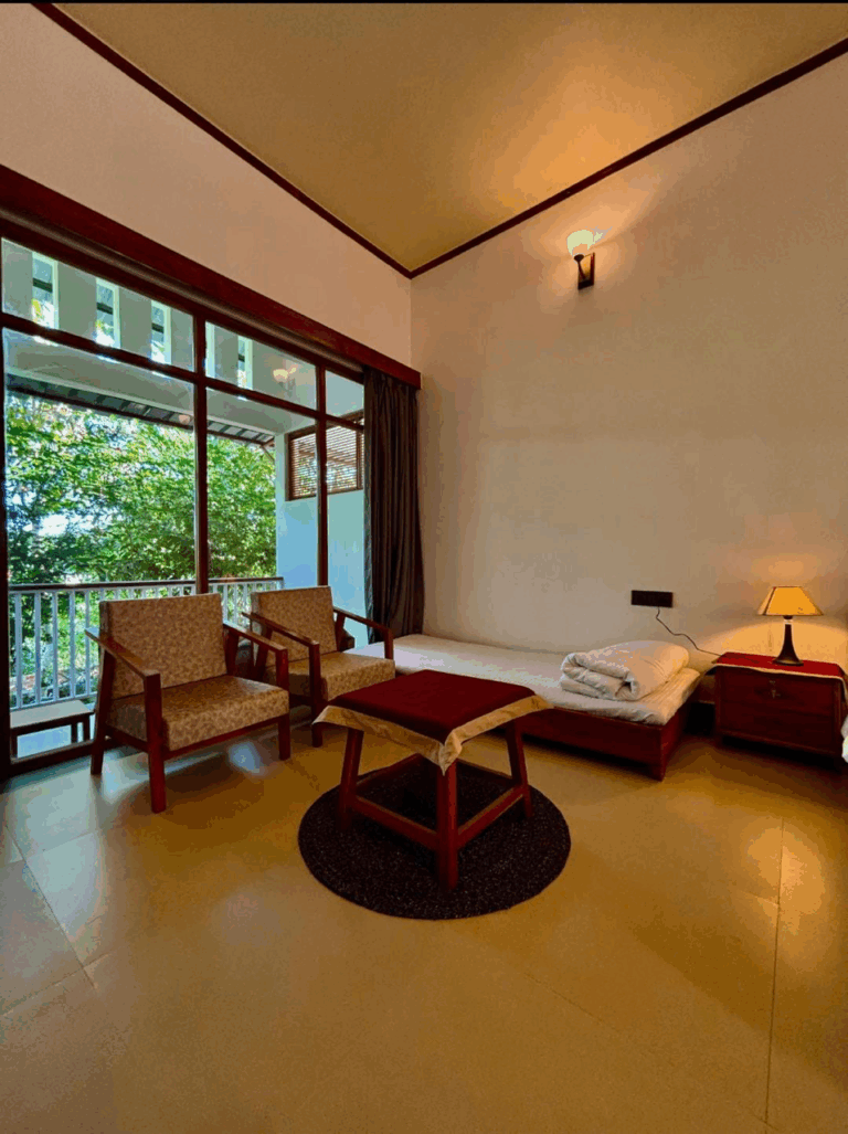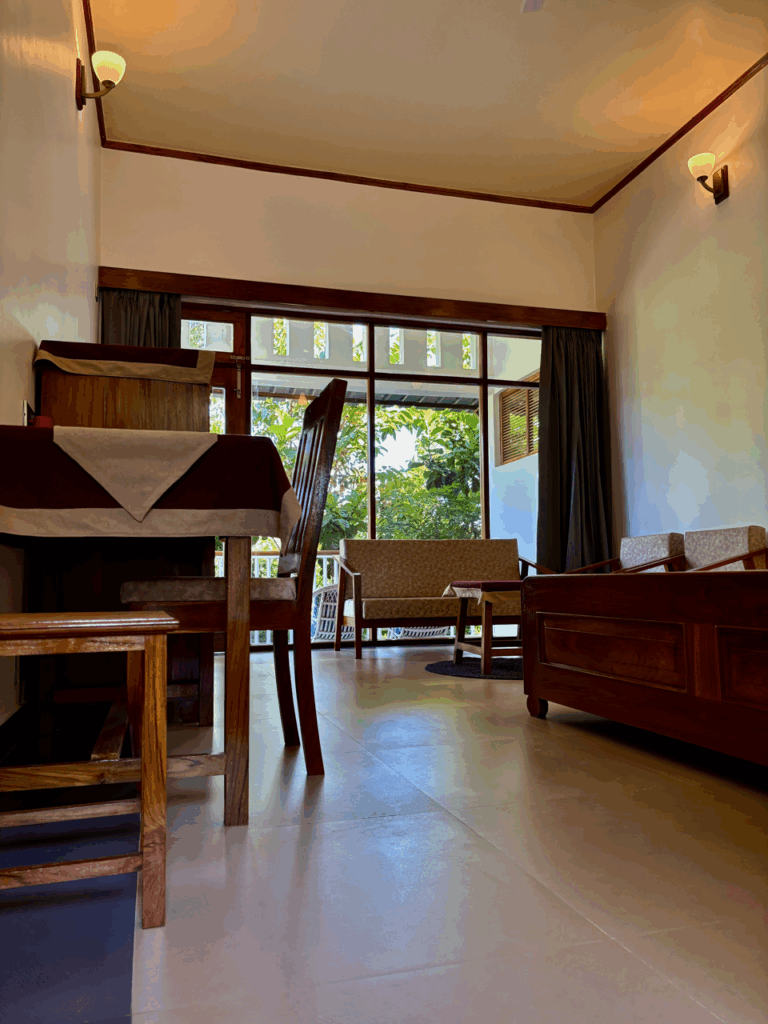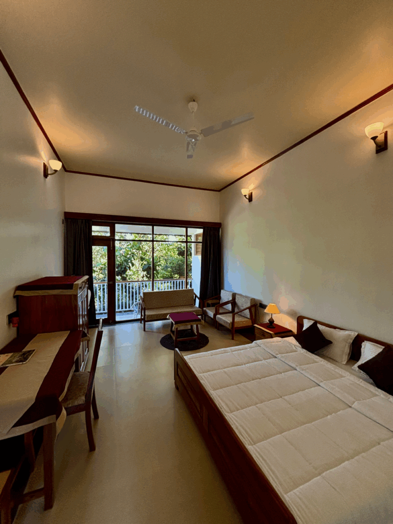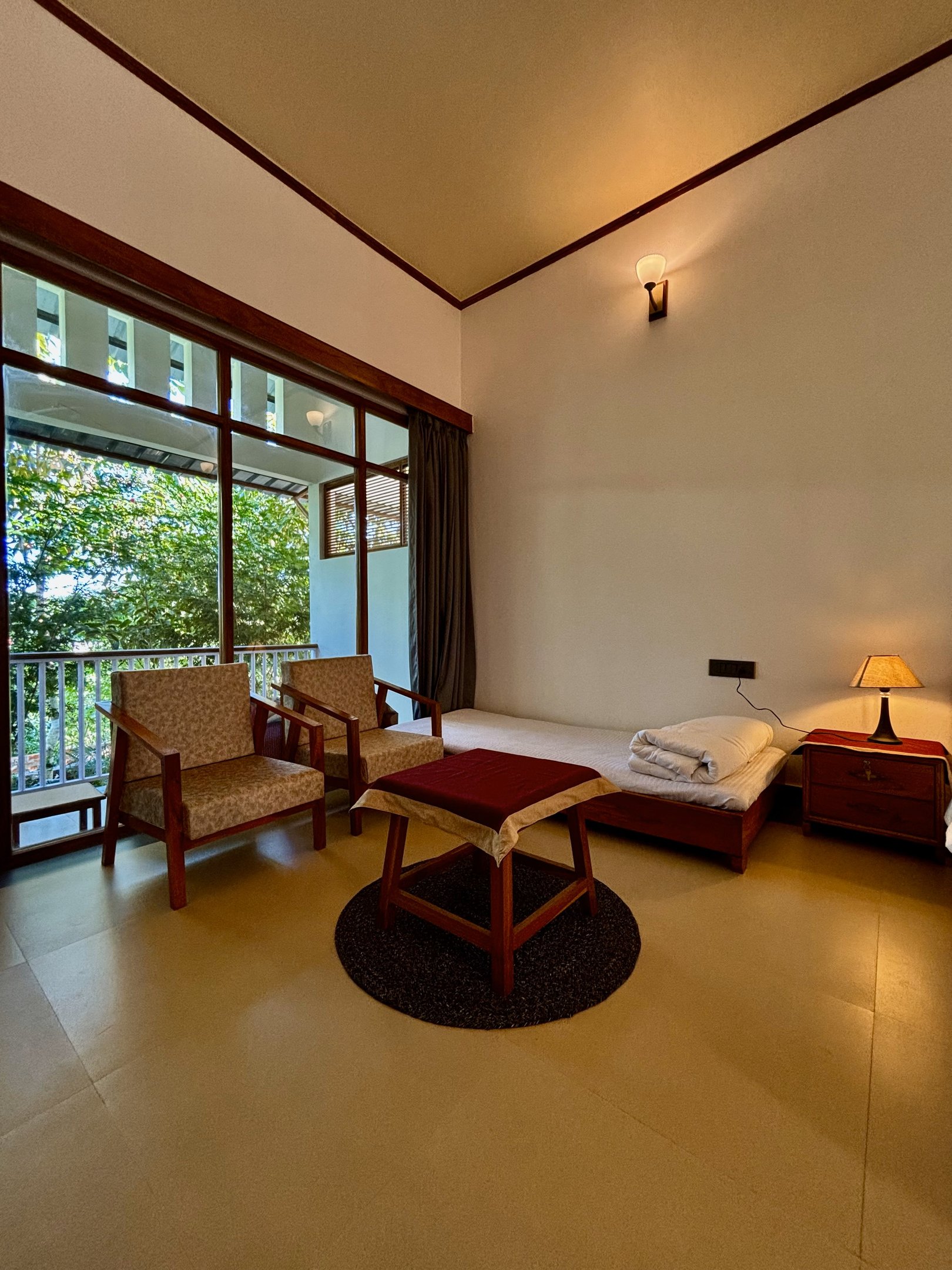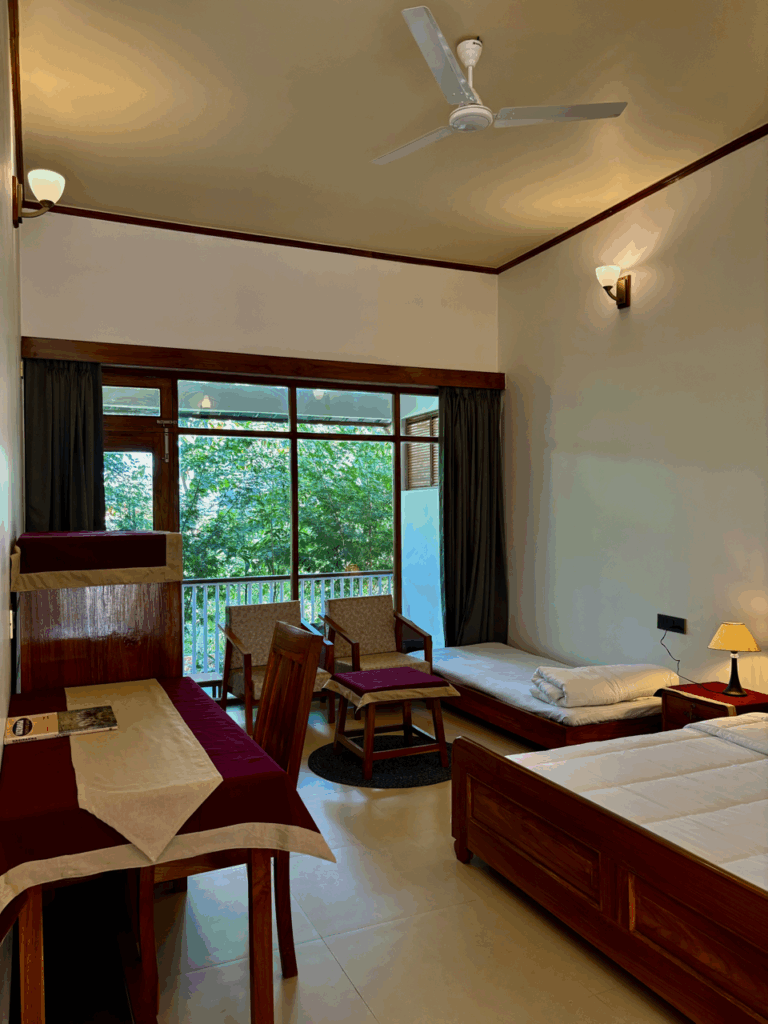 Our thoughtfully designed rooms offer a cozy, peaceful retreat surrounded by lush greenery and the gentle sounds of birdsong. Blending the rustic charm of the region with modern comforts, each room features a king-size bed with premium linens, a sofa, bedside table, spacious wardrobe with coat hangers, and a private attached bathroom with a geyser, shower, and basin mixer. The private balcony, complete with cushioned seating and a table, is perfect for enjoying morning tea, quiet reading, or simply soaking in the serene views. Whether you're a nature lover, birdwatcher, photographer, or simply seeking a break from the city, our rooms offer the ideal mix of homely warmth and natural beauty. From the first morning chirps to peaceful starlit evenings, Bougain Valley welcomes you with the genuine warmth of Assamese hospitality and the calming embrace of nature.